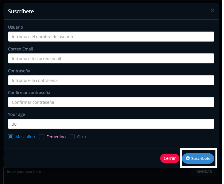 Les aparecerá la imagen para crear su cuenta y deben llenarla con los datos que deseen (su usuario, correo, contraseña y edad, {pueden mentir en la edad si quieren XD}) y luego dar click en el botón “Suscríbete”