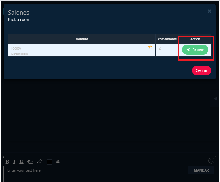 Lo primero que les sale al entrar, es una sección, que dice lobby (es lo único que sale) y ustedes, en vez de darle al botón “Cerrar”, deben darle al botón “Reunir”, ¡al verde!