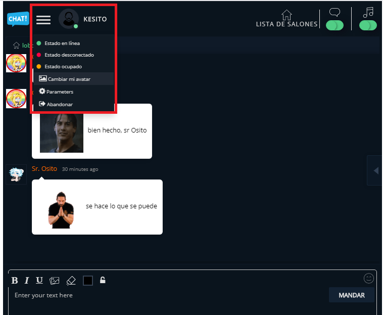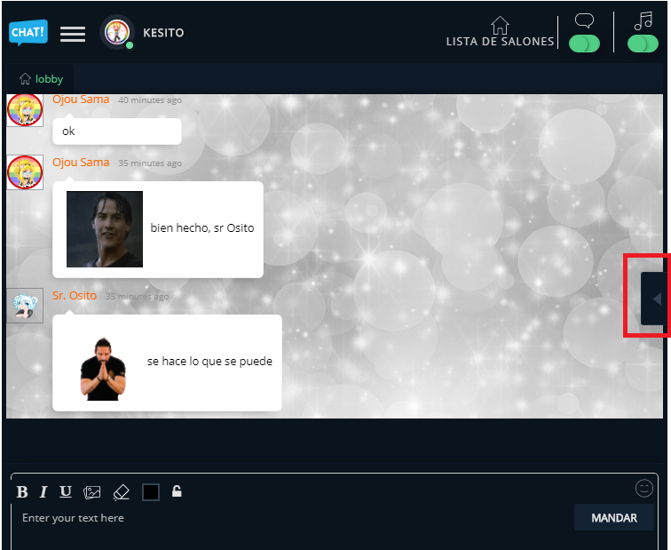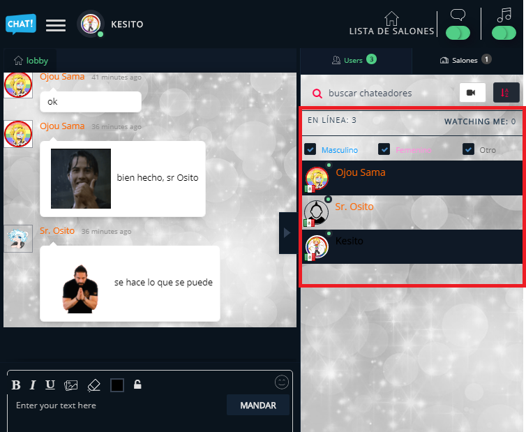 En esa barra desplegable, aparecerán todos los que se encuentran en linea. Como ven, el avatar del sr Osito es distinto, pero es que el avatar no se mantiene en la configuración si actualizas el chat (al menos no hemos encontrado la manera de hacer que se quede y tenemos que resubirlo cada que entramos)