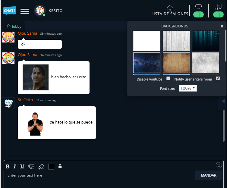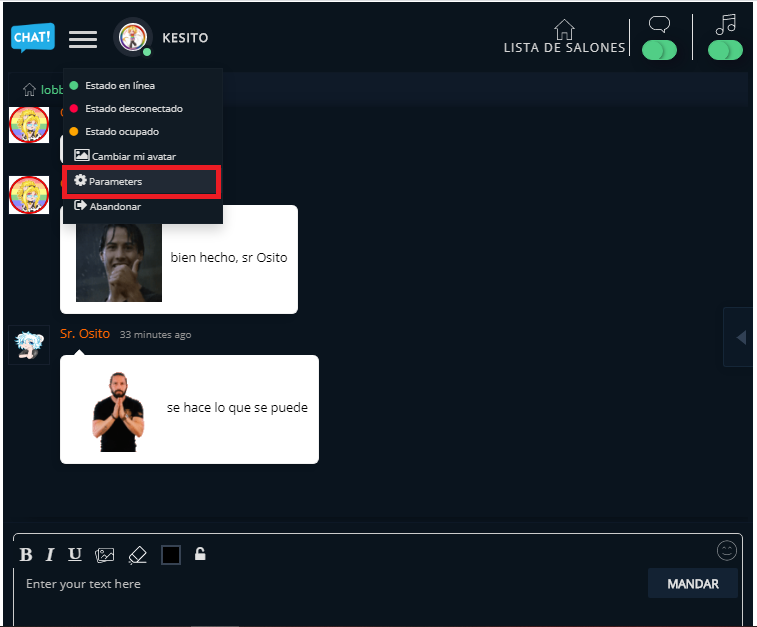Como ven, ya cambiado lo principal (el avatar) podemos ir a “Parameters” y podemos cambiar el fondo que es negro a otra cosa (el negro no permite que se miren bien nombres o mensajes XD error de uso pero yo soy una vaquita pinta, así que la pagina es blanca y necesitaba una mancha negra ajajajaja)